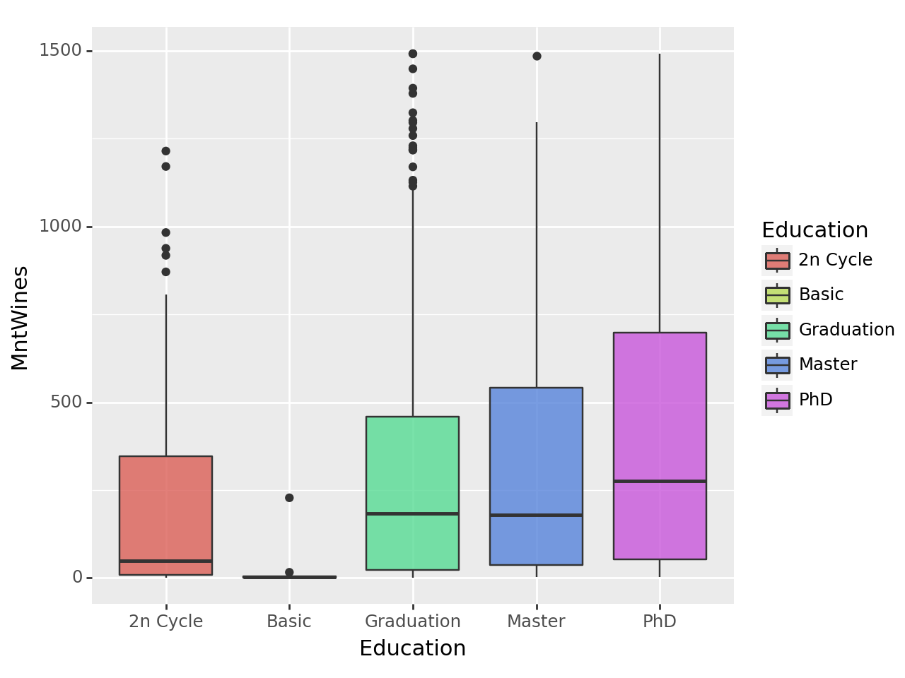 from plotnine import *(ggplot(merged_df, aes("Education", "MntWines", fill="Education"))
