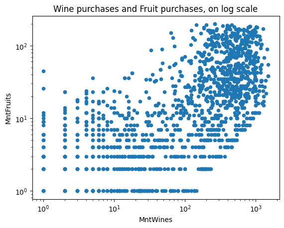 ax.set_title("Wine purchases and Fruit purchases, on log scale")Text(0.5, 1.0, ‘Wine purchases and Fruit purchases, on log scale’)